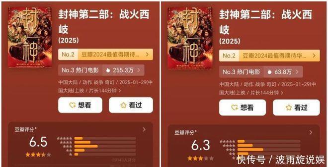 相似改编自中国传说的电影《封神第二部:战火西岐》则与《哪吒之魔童闹海》的走势,变成了明显的对比。它的豆瓣评分当前是6.3,比开分时的6.5,降了0.2。何况它的瞻望总票房由最高时的超20亿,降到了如今的15亿傍边。