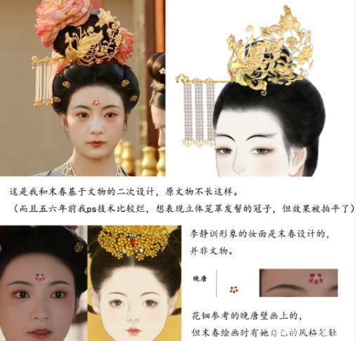 其还配上了《国色青春》剧照与其所著《中国妆束:大唐儿子行》中所呈现的妆容图片进行对比。