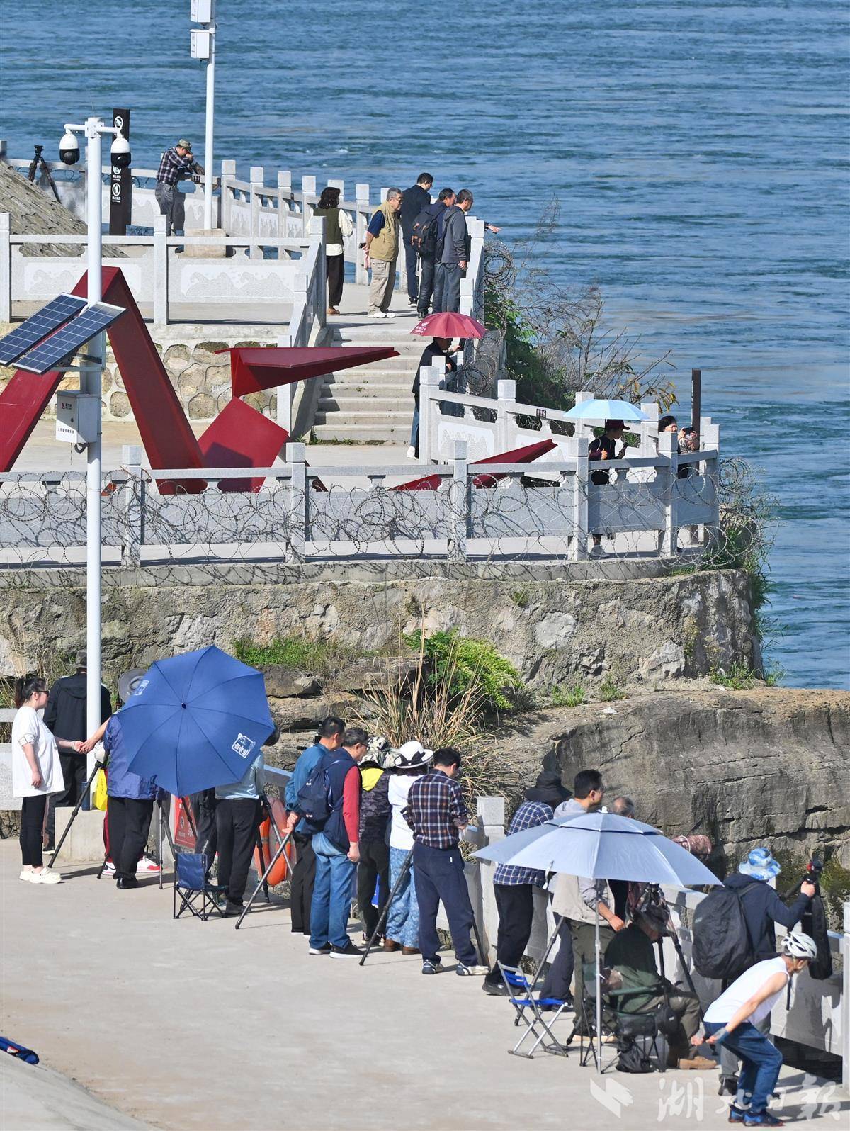 4月18日九游会欧洲杯,宜昌长江西坝大江游步谈旁,“蛇矛短炮”整王人排队,来自武汉、长沙等地的照相怜爱者们凝念念静候、屏气凝念念九游会欧洲杯,眼神牢牢锁定江面,只为再见“含笑天神”江豚,定格它们跃出水面、逐浪嬉戏的灵动蓦然,每一份期待都藏在镜头的信守里。