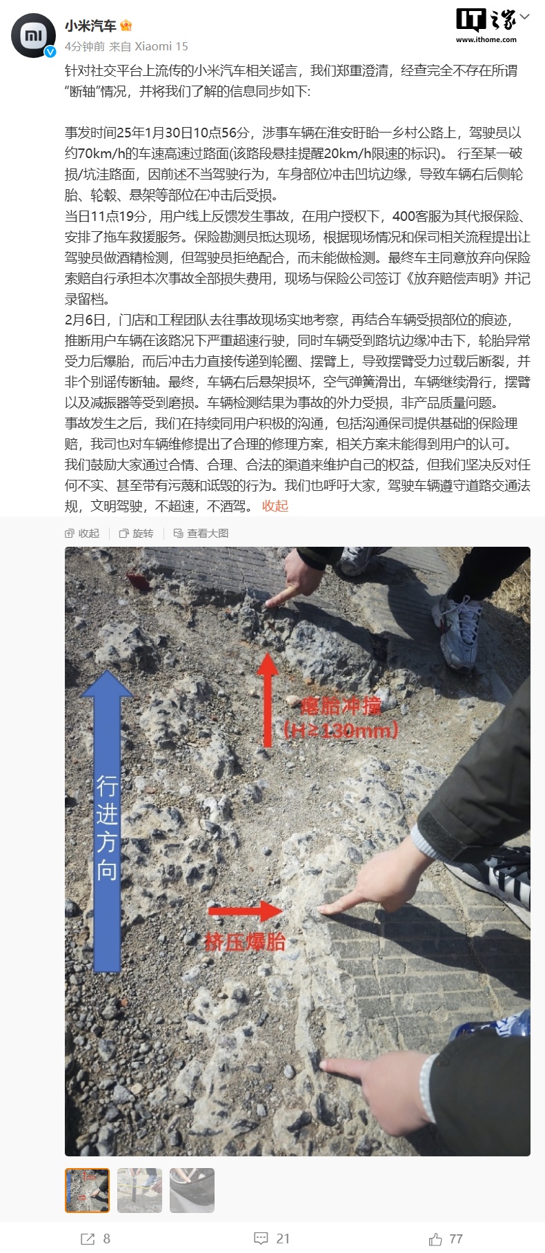 IT之家 2 月 9 日音问,小米汽车官方微博本日发文:针对酬酢平台高尚传的小米汽车关系谣喙,咱们防范澄莹,经查齐备不存在所谓“断轴”情况。