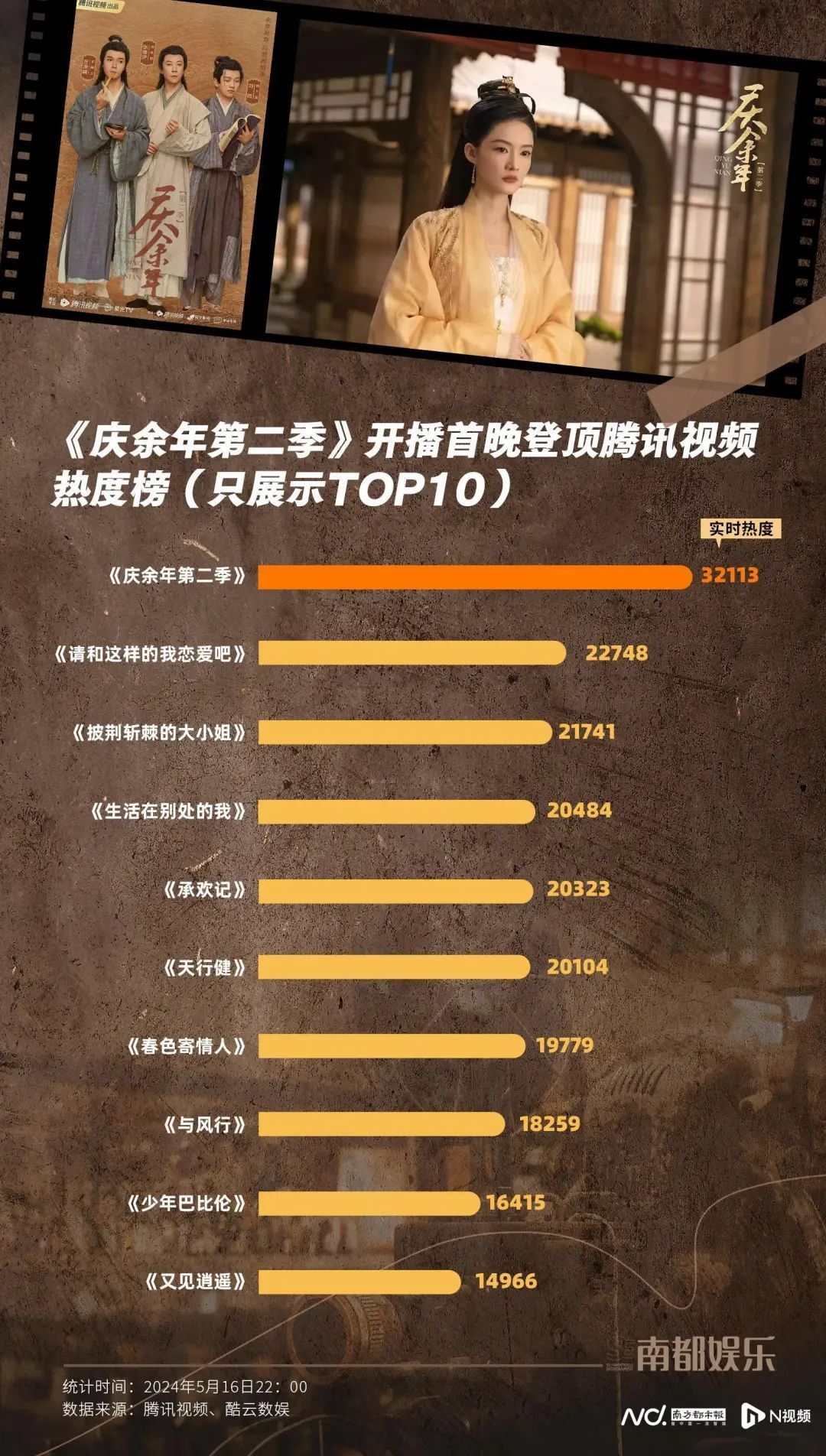 《庆余年第二季》在视频平台上相似成绩不俗。据酷云数娱自大,剧集开播57分钟后,站内热度值破3万,成为历史首个开播当日干涉腾讯视频爆款俱乐部剧集,同期成为历史最快干涉爆款俱乐部剧集。当日22:00,热度值更冲突了32000,高居站内整个节目榜首,高于《承欢记》《天行健》等热点剧集。#庆余年2##庆余年2 剧王#等话题集体循序登上微博热搜第一。