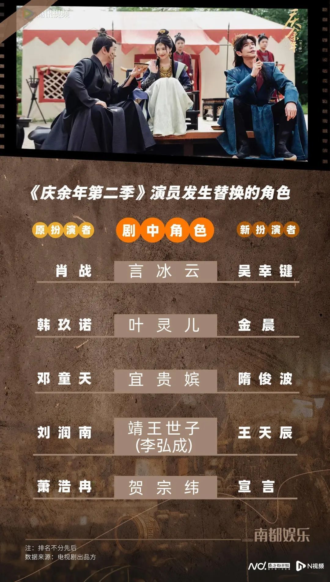据南都记者统计,一共有5名变装更换了演员。其中,肖战饰演的言冰云,有冷若冰霜的自傲感。《庆余年第一季》播出前夜,肖战借仙侠剧大火,也在一定进程上拉升了《庆余年》的收视和有名度。第二季中,言冰云的致力棒则被饰演过《东说念主世间》周楠的吴幸键接了过来。