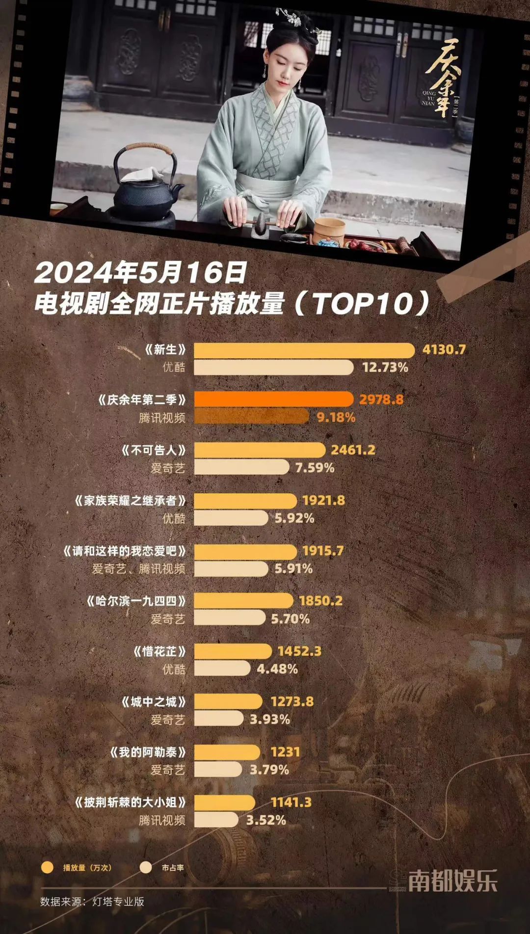 再对比全网播放量,第一天上线的《庆余年第二季》已收货近3000万播放量,市占率近10%,仅次于由井柏然、周照旧、王砚辉等主演的悬疑违章片《重生》,名步骤二。要知说念,5月16日已是《重生》上线的第11天。相对地,由林峯、佘诗曼等主演的香港无线电视与优酷的合拍剧《家眷荣耀之摄取者》、豆瓣评分达8.8的《我的阿勒泰》等热点剧集,单日播放量都莫得跨越2000万。