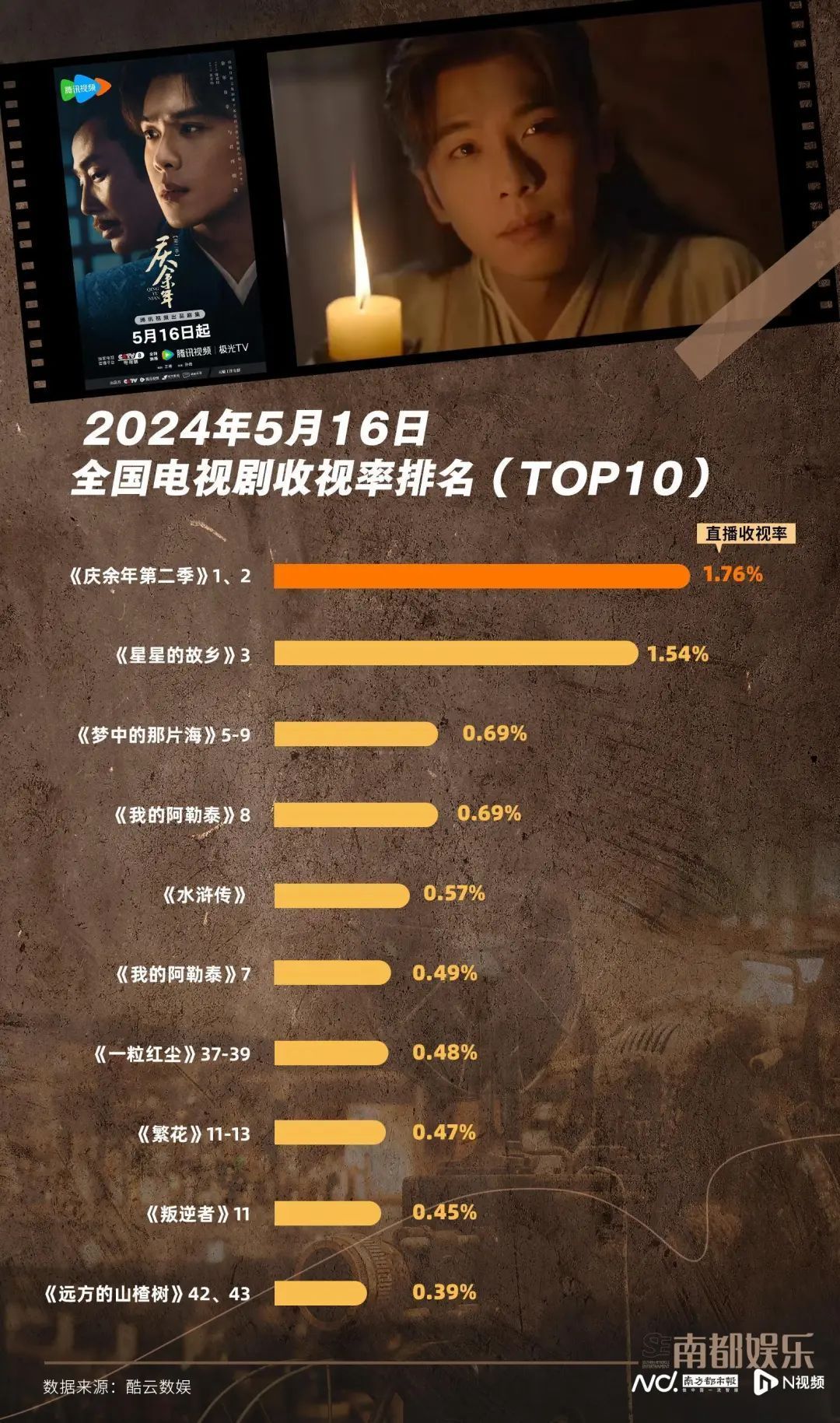 在收视率上,于央视八套播出的《庆余年第二季》成为今日的世界电视剧收视冠军。前两集平均收视率为1.76%,峰值破2%,跨越《我的阿勒泰》《似锦》等剧集。具体来看,第一集开始0.75%,峰值2.01%,平均1.53%;第二集开始1.73%,峰值达2.23%,平均1.99%。