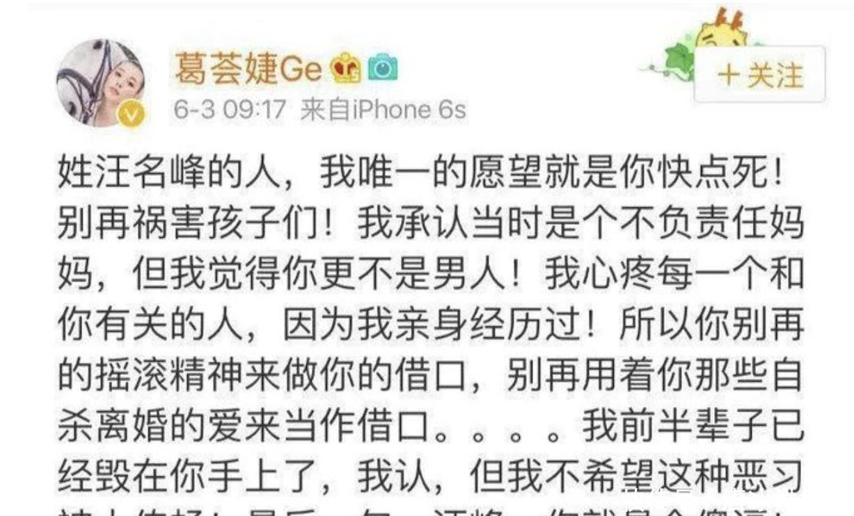 仳离后的葛荟婕精神崩溃,安故重迁,千里迷游戏、吸烟喝酒、尝试过自裁,还上节目爆料汪峰在她孕期出轨。