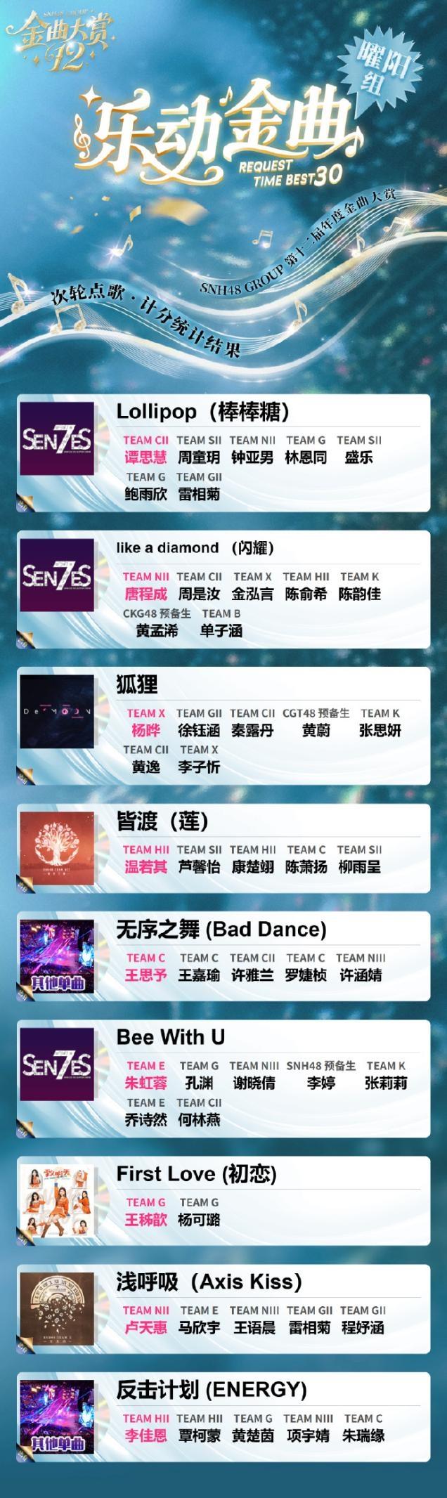 皓月组这次新增六首首次入围金曲速报的作品,成为最大惊喜。SNH48 TeamSII宁轲担任1号位的《AfterParty》、SNH48 TeamNII杨宇馨担任1号位的《巧克力之吻》、BEJ48 TeamE郭晓盈担任1号位的《Over&Over》等作品强势入局,其中23期新东谈主SNH48计算生蒋欣洳担任1号位的《里东谈主格》首次亮相便站稳脚跟,BEJ48 TeamB包楹担任1号位的《在东北的小偶像》更所以独有作风收货神志,CKG48 TeamG张琼予与SNH48 TeamHII蒋舒婷构成的甘休组合带来的《Like It》,则凭借剖判合营成为组内焦点,充分展现了重生代偶像与资深成员并存的多元竞争容貌。