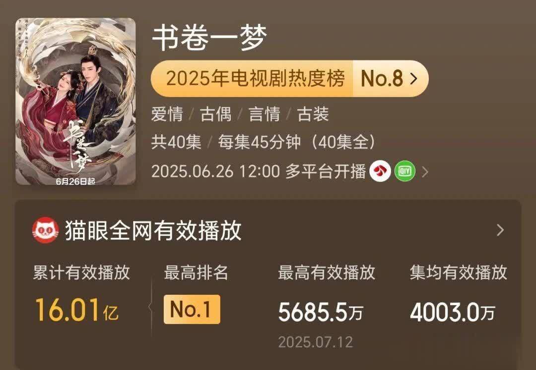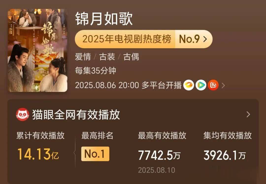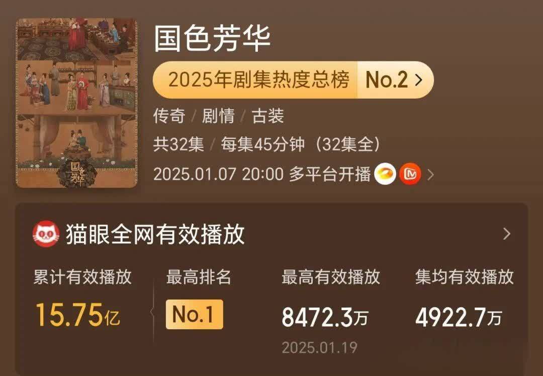 先容:杨紫和李现双顶流主演的这部剧,以猫眼热度9809.28登顶2025古装剧榜首,斩获21次日冠。CVB收视率位居湖南卫视年度亚军、古装剧第一。网播方面,云合、酷云集均播放量均创芒果平台历史新高,抖音话题播放量破173亿,稳居全网热度C位。