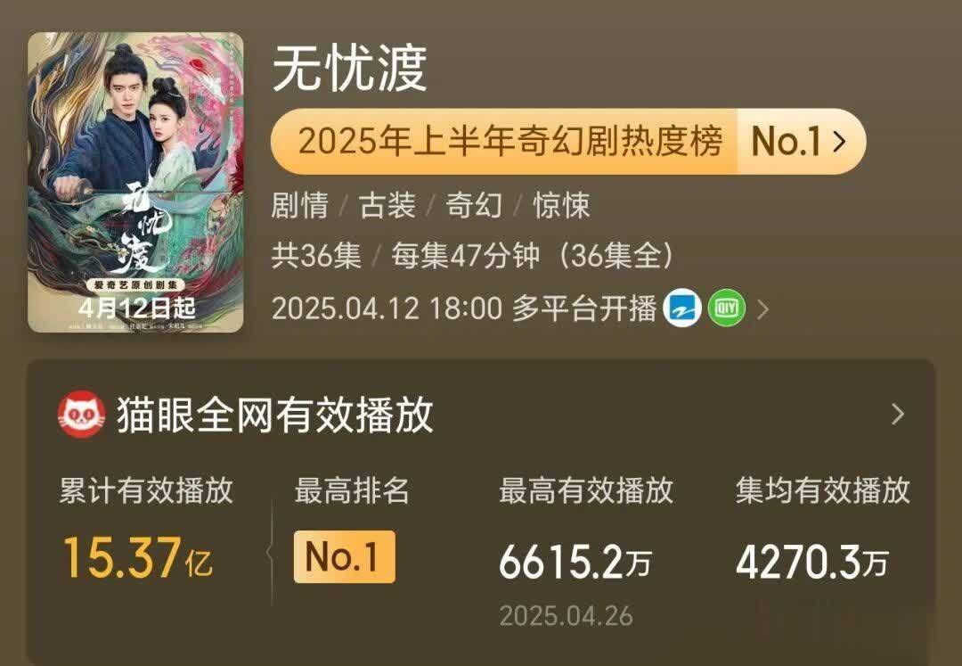 先容:这部剧以16亿的有用播放量斩获年度古偶冠军,爱奇艺站内热度最高冲破9611,创年度新记录。开播首日热度即破7687,刷新平台首播记录,衔接霸榜猫眼、灯塔等各大泰斗榜单,达成“热度长虹”。凭借超高热度,该剧荣获“2025爱奇艺尖叫之夜国民殿堂”荣誉,并斩获猫眼剧集热度周榜、电视剧热度周榜等多项冠军,成为名副其实的情状级爆款。