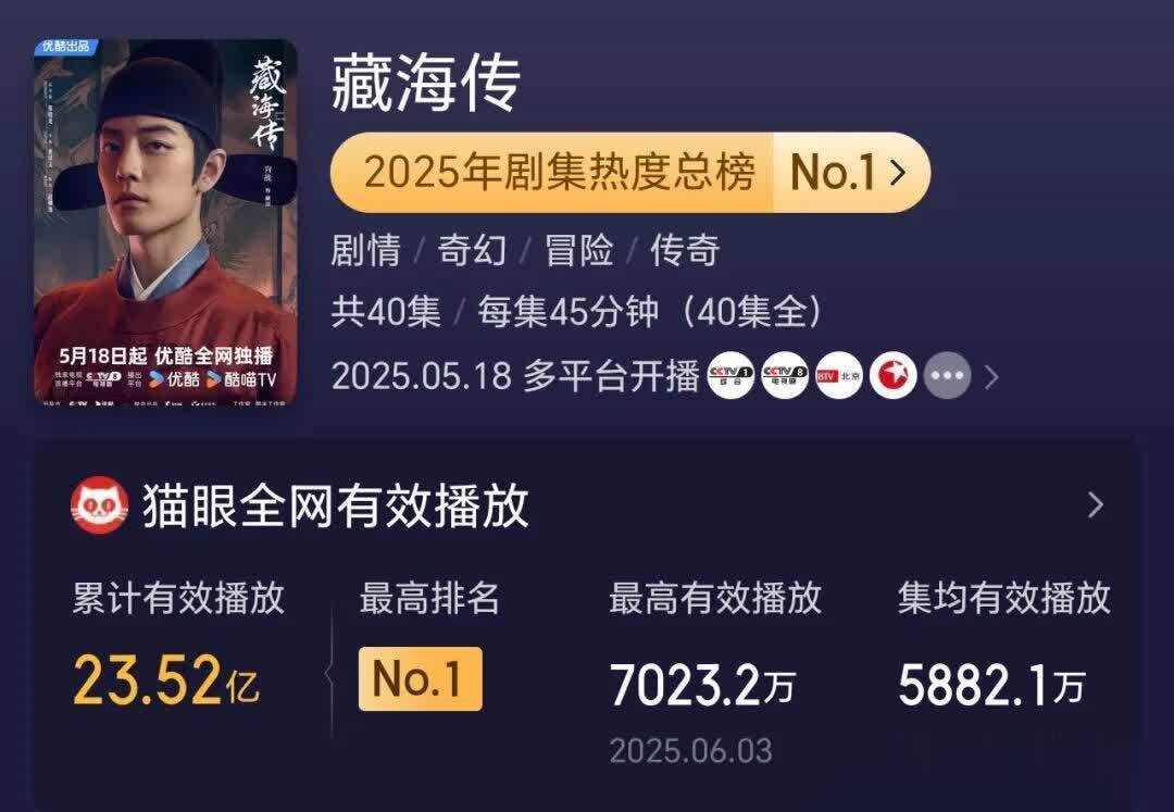 01《藏海传》23.52亿 主演:肖战,张婧仪先容:这部古风权略剧真的是2025“剧王”级爆款,优酷站内热度峰值高达10465,刷新平台历史记录。全网正片播放量冲破23.52亿(部分统计达30.91亿),集均播放超6600万,以王人备上风包揽灯塔、云合、猫眼等七大泰斗榜单年冠。