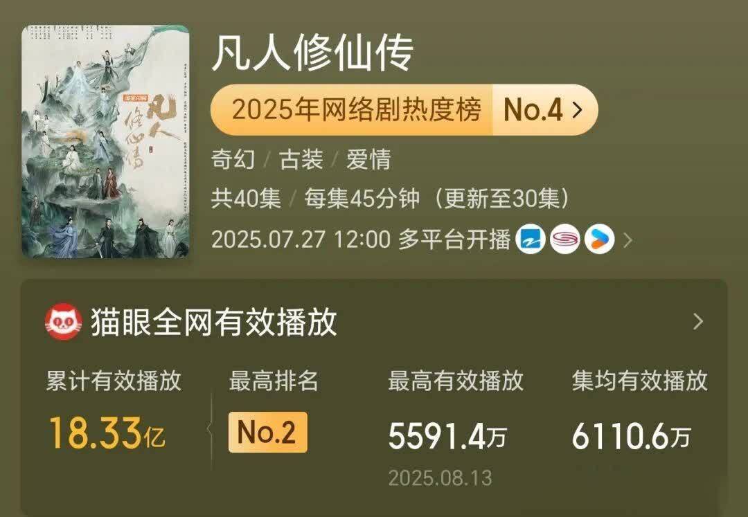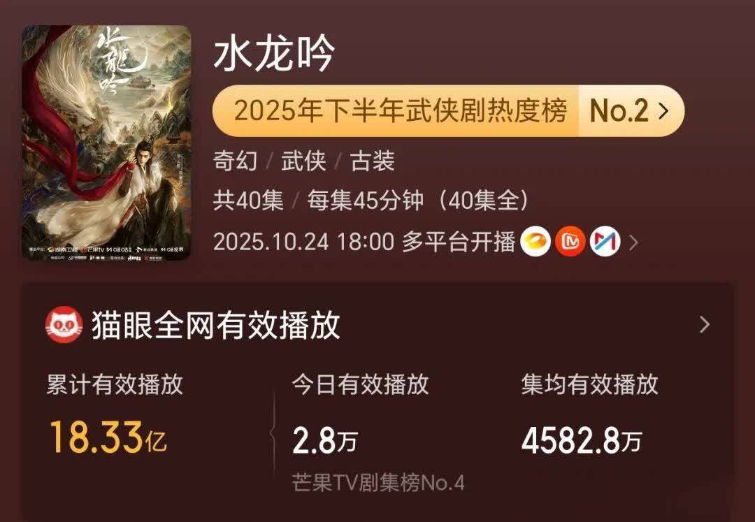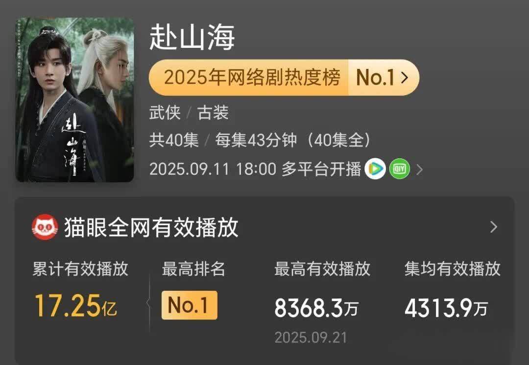 先容:这部武侠剧以猫眼热度9794.99拿下2025年网剧冠军,全网有用播放量破17.25亿。腾讯视频开播1小时热度破26000,创年度最快记录;爱奇艺首日热度破7657,双平台霸榜。微博阅读量破47亿,抖音主话题播放破100亿,稳居各大榜单榜首。