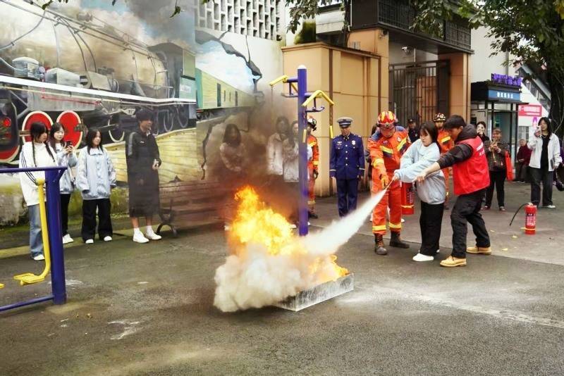 晨曦社区网红打卡点“消防体验专列”体验熄灭器使用。资阳市消防调停支队供图