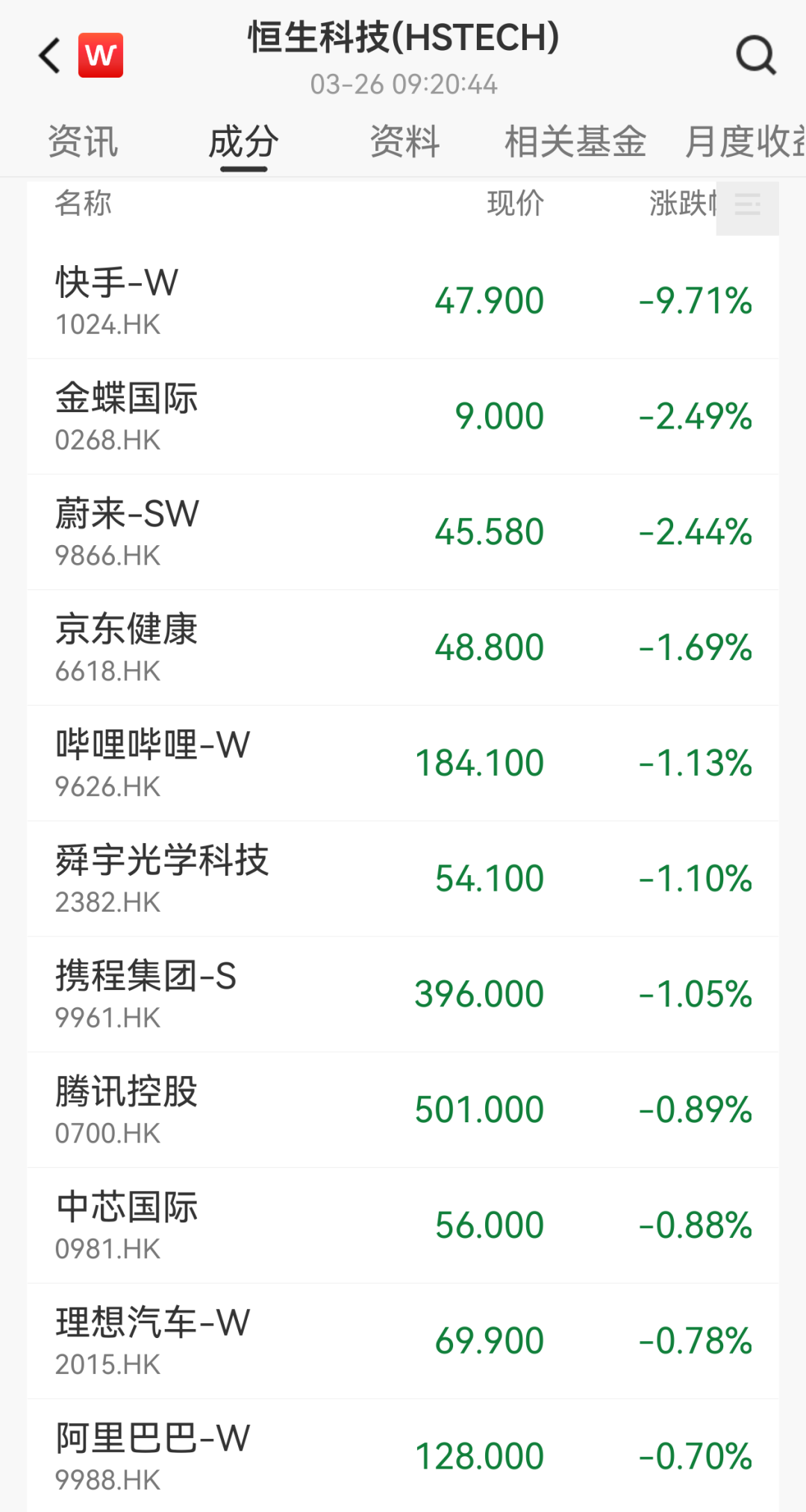 恒生指数低开0.27%,恒生科技指数跌0.68%。科网股多半下挫,快手跌近10%,金蝶国外、蔚来跌逾2%,哔哩哔哩、京东健康、携程跌逾1%。高潮方面,京东集团涨超2%。