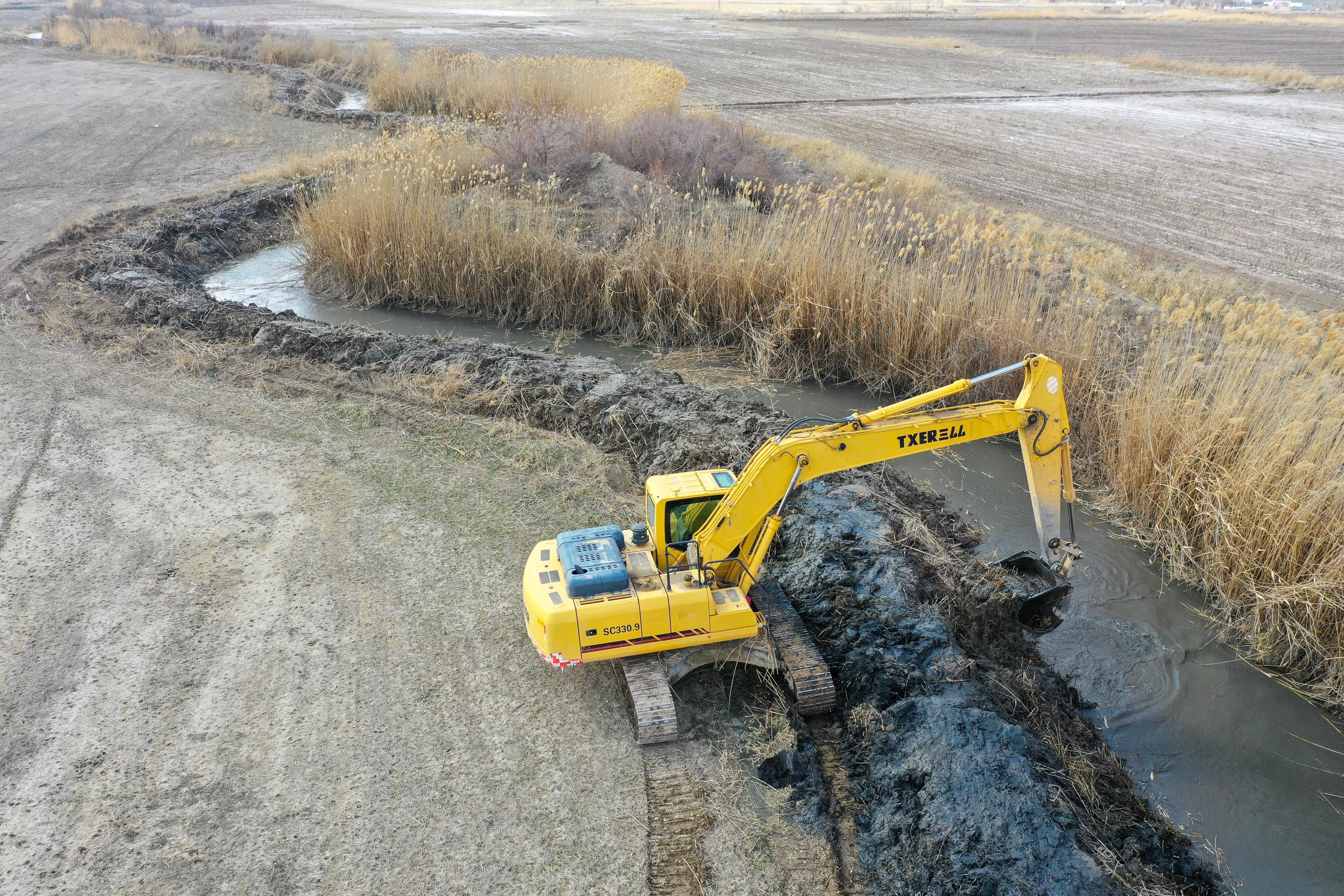 责任主谈主员驾驶挖掘机在新疆伊犁哈萨克自治州察布查尔锡伯自治县堆王人牛录乡进行清淤功课(无东谈主机像片,3月24日摄)。新华社记者 丁磊 摄