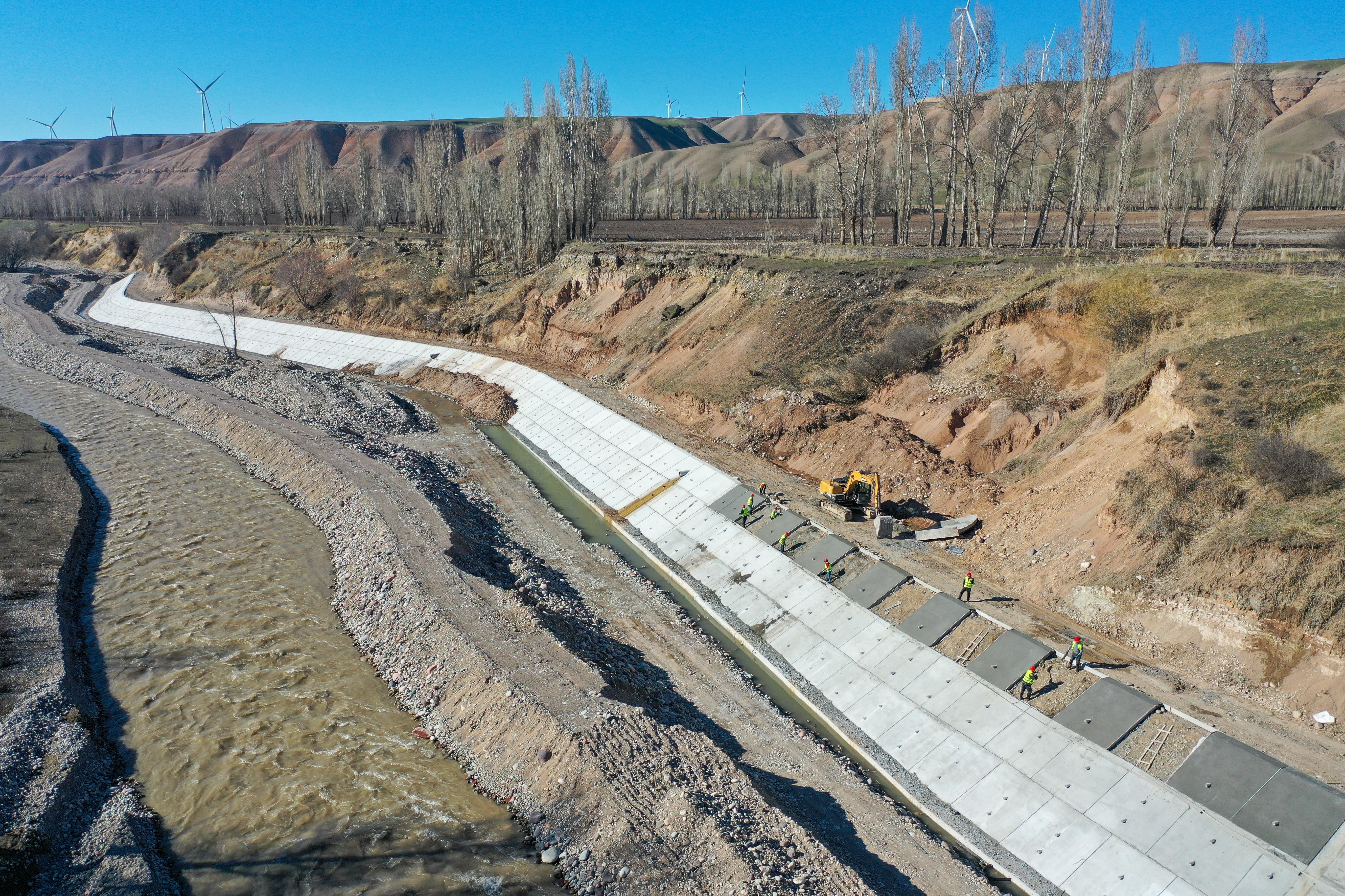 施工东谈主员在新疆伊犁哈萨克自治州新源县修建大吉尔格朗河护岸(无东谈主机像片,3月27日摄)。新华社记者 丁磊 摄