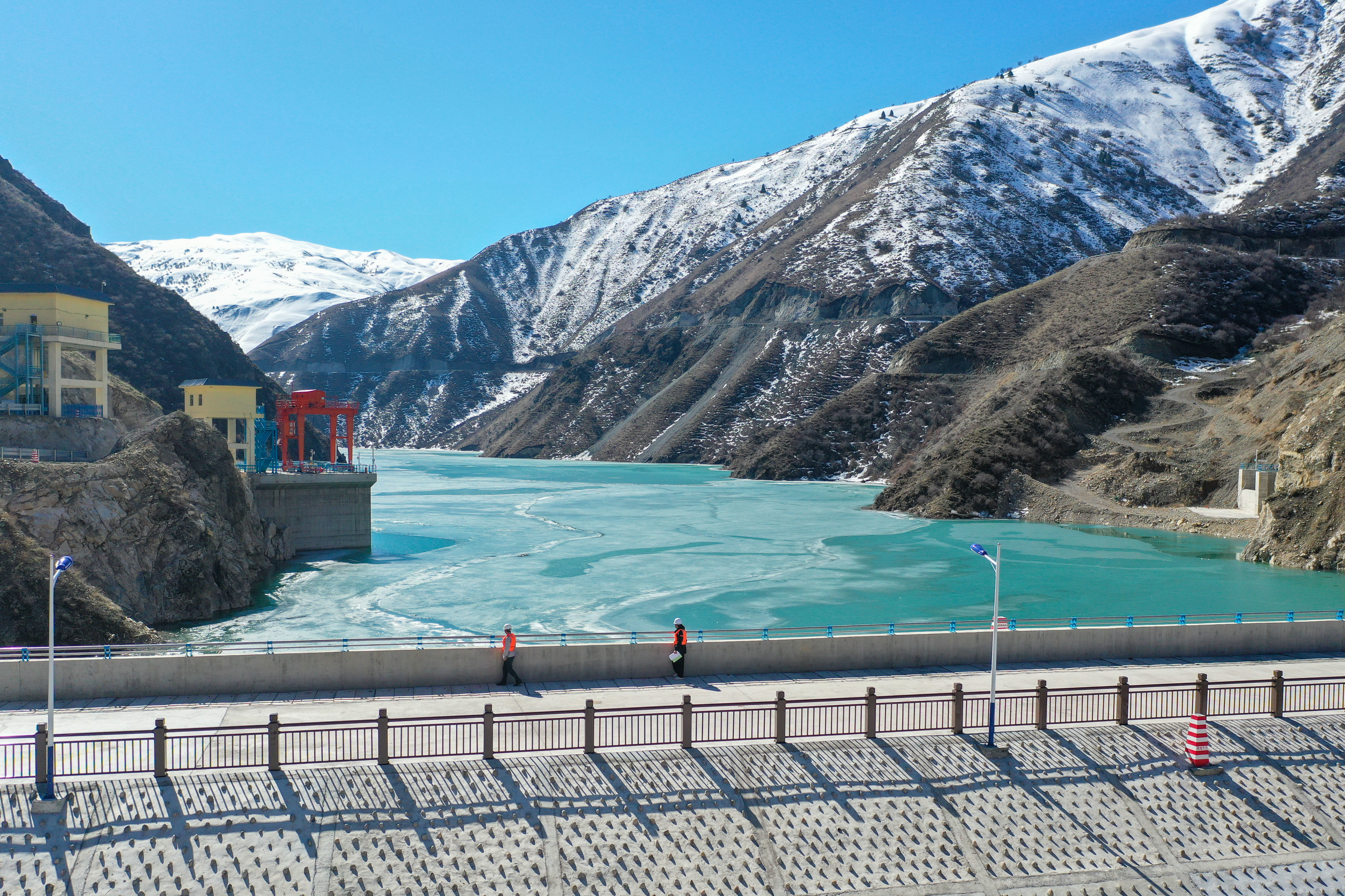 运管东谈主员在新疆伊犁哈萨克自治州新源县恰普河水利重要旁观(无东谈主机像片,3月27日摄)。新华社记者 丁磊 摄