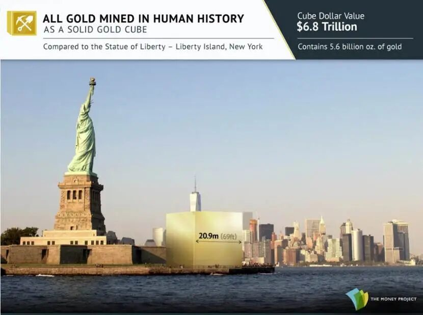 今天世界上扫数开导出的黄金,约为22万吨,若是溶化成一个实心正方体,大致是22.5米边长的一大块金属。