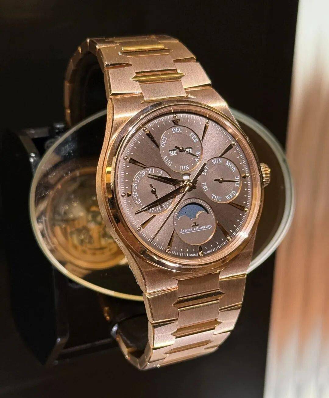 表联贯纳了垂直拉丝与高抛光交错打磨的手法,这自身就很费工了,但积家还更进一步,在表链外侧链节作念了 V 型倒角。