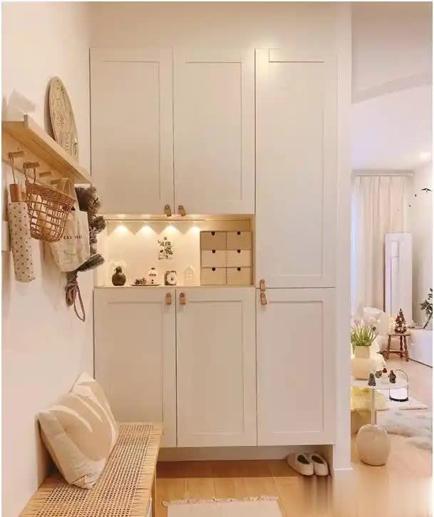 入户莫得玄关,她就我方砌了半堵假墙,嵌进去一个顶天随即的鞋柜,底下悬空放常穿的鞋子,中间留出台面放钥匙和包包,上头挂穿着帽子,小数空间皆没花消。