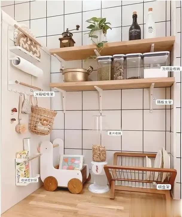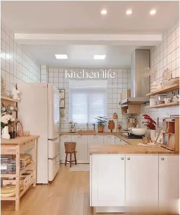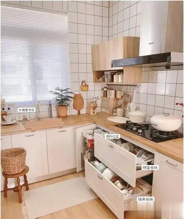 厨房作念成了通达式的,6平米的小空间作念成U型橱柜,洗切炒动线终点顺。她没作念太多吊柜,而是在墙上装了几块木板和挂钩,锅碗瓢盆皆挂起来,拿取浅易还省钱。