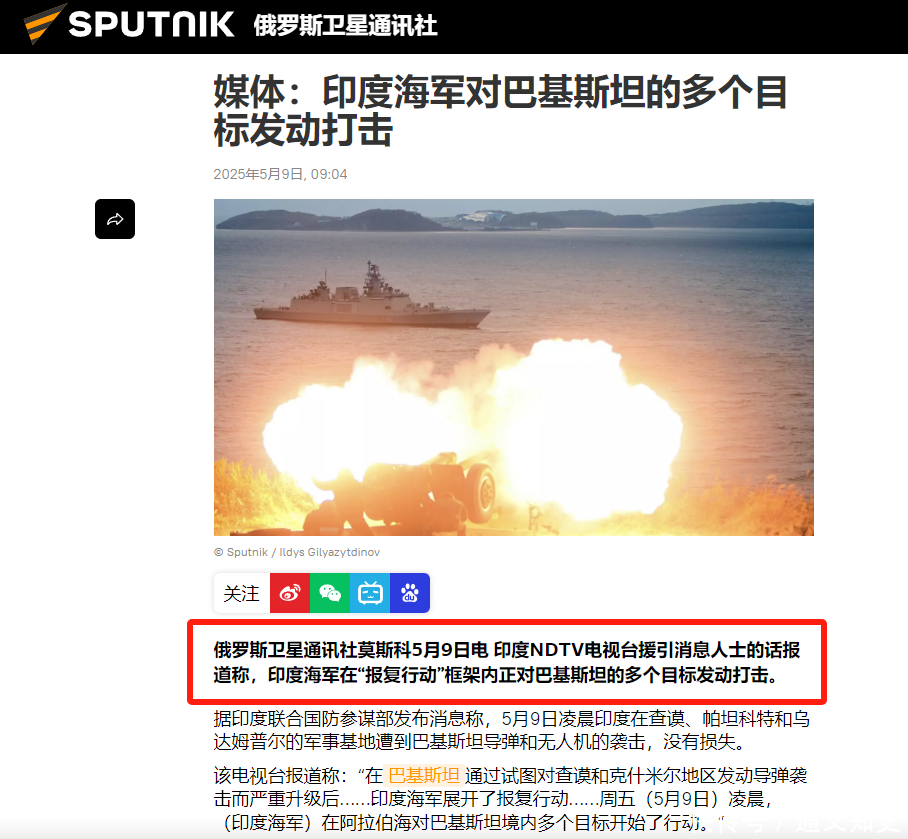 2025-05-09 09:04 俄罗斯卫星通信社 媒体:印度舟师对巴基斯坦的多个目的发动打击